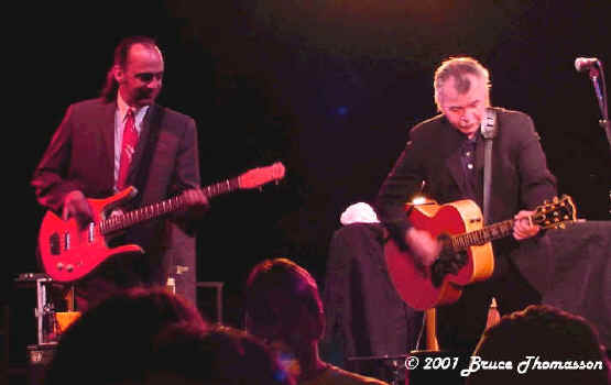Prine did two songs that I was not familiar with, but still I saw a couple of people in the crowd who were singing along. It was a very tight trio with a bass man David Jacques and Jason Wilber who played mandolin, guitar, and harmonica. As always, Prine was humorous and having a good time. At one point, while being bombarded with moths buzzing the stage lights, he said 'I wish a big one would just come along and get it over with'. He also talked some about a movie he had filmed here three years ago with Billy Bob Thornton and Andy Griffith: it's so good they haven't released it yet. (While he was here for the filming a friend of mine who went to school with Billy Bob wound up having lunch with Billy Bob, Andy and Prine.....I would have liked to have been in on that.) ©2001 Bruce Thomasson Photos are exclusive to the John Prine