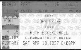 1. SPANISH PIPEDREAM (BLOW UP YOUR TV --band leaves-- 11. DEAR ABBY --encore-- 26. EVERYTHING IS COOL ObservationsRuth Eckerd Hall in Clearwater was a pleasant surprise. It is a modern theater, well maintained, located out of the city in an almost park-like setting. It had a successful look to it, and seeing a building like this sort of sets the mood for the rest of the evening. I was floating about the auditorium previous to RB, just talking to people. I always run into interesting persons with whom to talk. One couple, who's names I didn't get, have a computer, have been on the net, and will look up the chat-page when they get it fixed. They were quite interested in seeing PMS' Prine Shrine! I talked to a couple to my left before the show, and they were not on the Internet, but said they had a friend, John, who was, and who had told them about the page. We talked at length--it was Jack and Becky, and then they left to buy some souvenirs. When they returned, Jack asked, "Is your name Jerry?" Surprised, since I had never introduced myself, I admitted to this, not sure just what to expect. He reached into his pocket and brought out a worn 'WOG's Dallas Setlist' that he had folded up into quarters "We brought this...and ... John! John smiled and produced his own WOG List...he had made it up for both of them. Complete with their small flashlight, these guys were ready to follow the possible list of songs! Needless to say, these fine people were invited to see John Prine after the show, and I took pictures of them with the man. Another couple I met also went backstage; they had also seen the Jacksonville show and had, of course, loved it. From Mobile, Alabama, they have firm plans to hit the Birmingham show in June...I told them to tune in to the chat page..."Space Monkey/Mannie/Mike" plans a trek there, as do I...we may all meet again. John was tired after this show, and there were probably 30 waiting for him to eat and then greet them. I wished only to give him the Jacksonville reviews, and be on my way. As usual, I waited to be last. John's last two guests were both drunk, but he treated them with respect and, if you've ever tried to get away from an adoring drunk, was a lesson in tact and patience. Mitch had to keep coming in and yelling at them that "we gotta go! They need to empty the building!" He yelled everything but fire. but one guy, a fellow with a pony tail attached to his cap, had to keep talking to John about the door he put on the house John just sold...then demanded that John make that security guy give him the two beers he saw over there...turns out he had seen them in John's own dressing room, which was now locked. John went and fetched the guy the two beers, but it didn't get rid of him... Finally, I just went in and left my stuff with Mitch. "Where you goin' next?" he wondered. "Mountain Stage at Huntington, I guess," I answered. "Great! See you up there, Jerry!" he said. John had preceded me into the small room, and already he was a million miles away, dead tired. He didn't even look over to say goodbye. Three hard performances in a row had taken its toll. He straightened the 1-pound bag of chips topping his nylon traveling bag and made ready to hit the road.