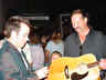 The night was already looking good. Outside the theater, we met more fans. Kathy 47 and her chauffeur Thom, Brian Frain, James and Linda Barnett, my nephews Darby and Josh and their girly friends Autumn and Amanda, G.B, Alan's parents Ruth and Gary, Jeff and Roberta, John and Rosemary Fouth (Julie's parents), Joe and Chris (Julie's brother and wife) and Bobbie and Jessica (my daughter and son-in-law). Once inside and seated we were treated to the talents of Greg Trooper. He is quite an act. Very good vocals and guitar playing. I have never heard Greg before but I WILL get some of his music. I was impressed. After Greg's performance, the lights came up and we visited with some more friends. We met Kim, the lady that supplied the corn, Lyla, and a few others that I can't remember names of. The lights went down. John and the Boys took the stage. I didn't get the set list, but I'm sure Reeda has it. After a few songs, John said, "It's good to have the Shriners here tonight." It was really hot in the theater and John was using a towel after every song. Someone from back stage finally brought out a fan and turned it on. I don't think it helped much on stage but I could feel a breeze from it every now and then. The band continued on like the professionals they are. Not a word was spoken about how hot it was up there. They played all of our favorites and a new one to boot. The show seemed short, but Reeda and I checked the set list later and all the songs seemed to be there. They quit with Lake Marie as they usually do and came back for the encore. They did a couple of songs and John invited Greg Trooper back to the stage.